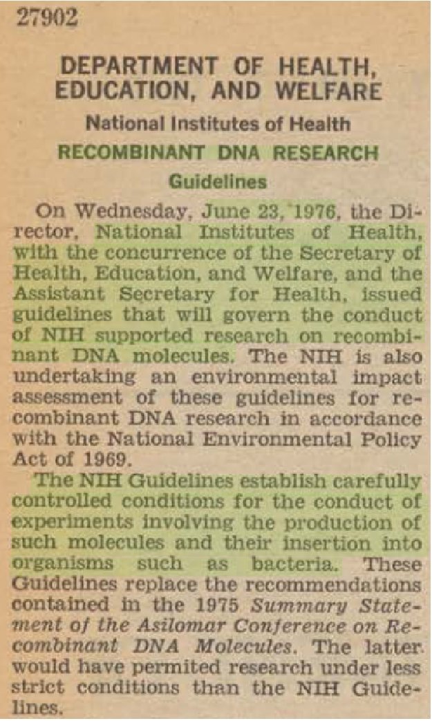 (Federal Register, National Institutes of Health, Recombinant DNA Research, 7 July 1976)